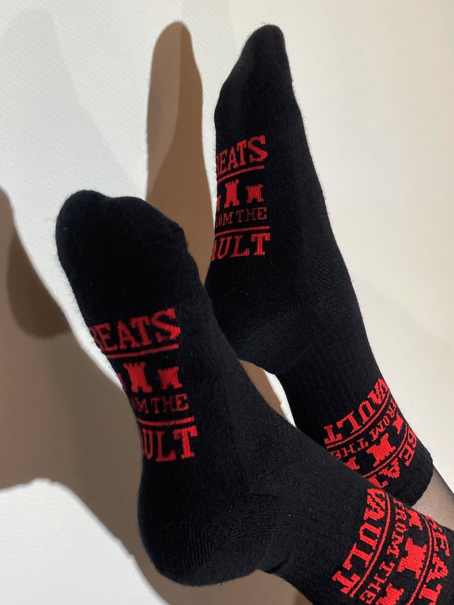 Red logo, black socks.